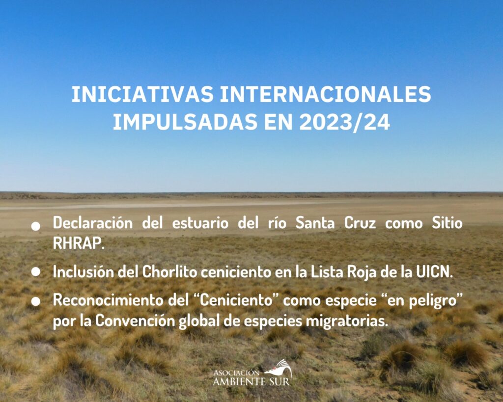 Asimismo, en 2023, por el trabajo de investigación y censos binacionales de Chorlito ceniciento o Chorlo de Magallanes (Pluvianellus socialis), realizados por iniciativa del Proyecto Pluvianellus que implementa Ambiente Sur junto al Centro de Rehabilitación de Aves Leñadura (CRAL) de Punta Arenas, se logró la reconsideración de la categoría de conservación de este ave en la Lista Roja de la Unión Internacional de Conservación de la Naturaleza (UICN), siendo la especie recategorizada como “en estado vulnerable”.
